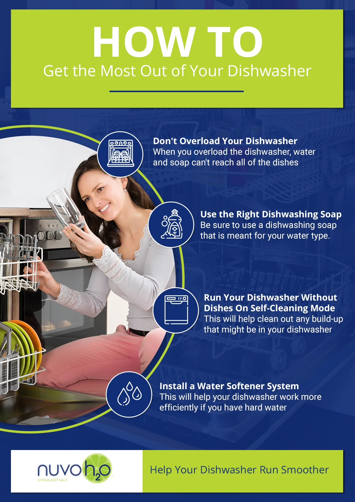 For some people, a dishwasher is a must-have appliance and it's important to know what makes it work more efficiently. Follow these tips to make sure that you are getting the most out of your dishwasher. Contact NuvoH2O to install one of our water softener systems today!